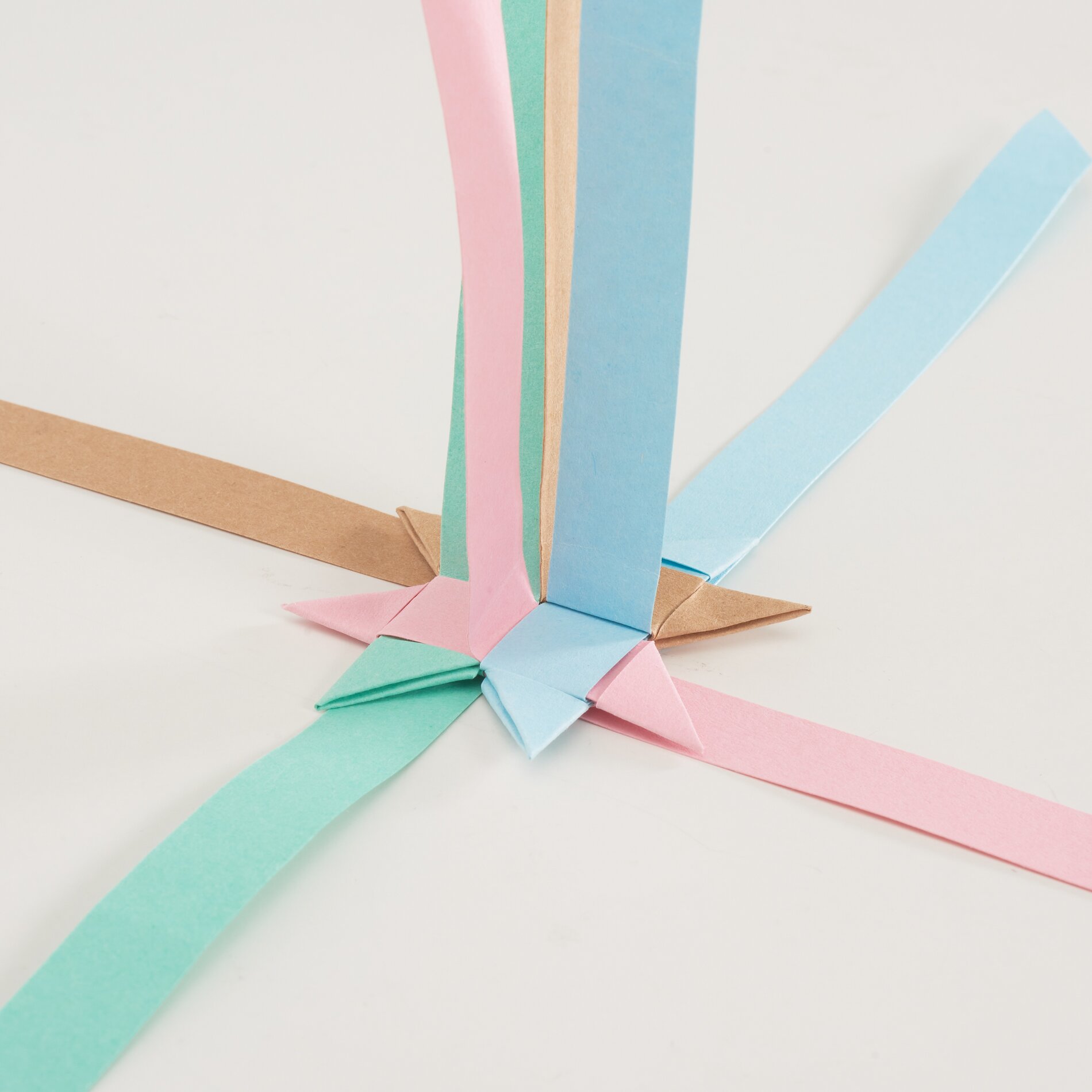 Voor elke Fröbelster heb je 4 even lange papieren strips. nodig. Voor een klassieke Fröbelster wordt meestal papieren strips gebruikt met een lengte van 45 cm en een breedte van 15 mm. De Selectie van papieren strips. is net zo gevarieerd als de verschillende maten Froebelsterren. Over het algemeen is de verhouding tussen breedte en lengte 1:30. Dit betekent dat voor een breedte van 1 cm een papierstrooklengte van 30 cm nodig is en voor een breedte van 2 cm een lengte van 60 cm.Vouw de strook linksboven naar beneden.