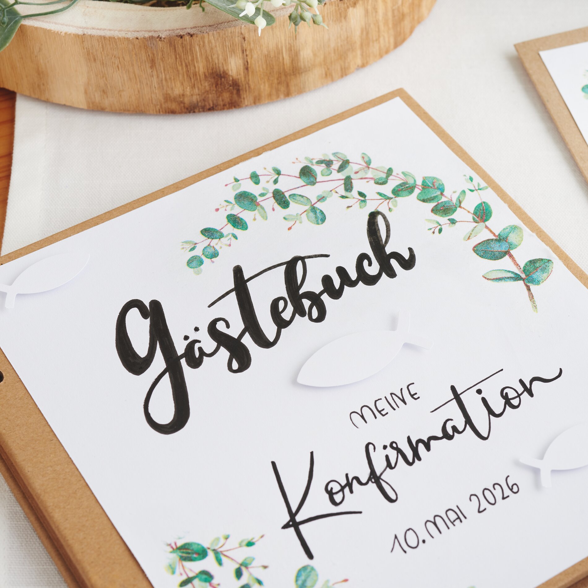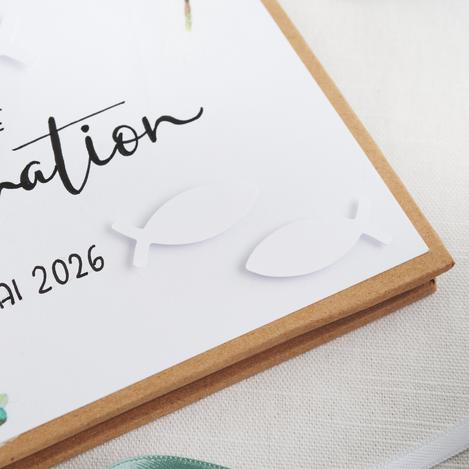 Plak de afgewerkte servetpapiertjes met VBS knutsellijm op de kaart en het gastenboek. Pons vissen uit fotokarton en plak ze op je ontwerp met 3D zelfklevende pads voor een speciale look.