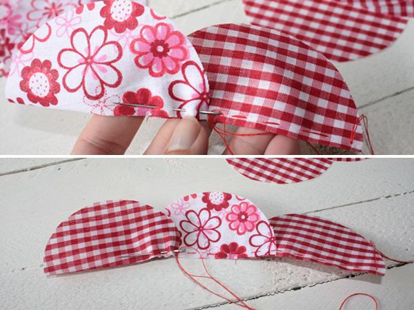 Eine weitere Möglichkeit ist es, die Blütenblätter etwas anders zu arrangieren. Statt sie nacheinander weg auf dem Faden aufzureihen, werden sie leicht überlappend verarbeitet. Nach ca. 2/3 wird jeweils das nächste Stoffstück mit angenäht.