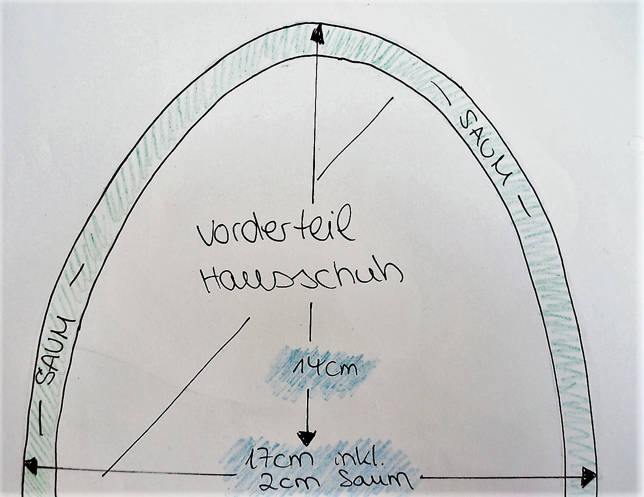 Für die Fußspitze könnt ihr euch super eine Socke in der gewünschten Größe zur Hand nehmen oder euren Fuß umzeichnen. Dann habt ihr schon einmal die grobe Form für die Spitze des Schuhs.