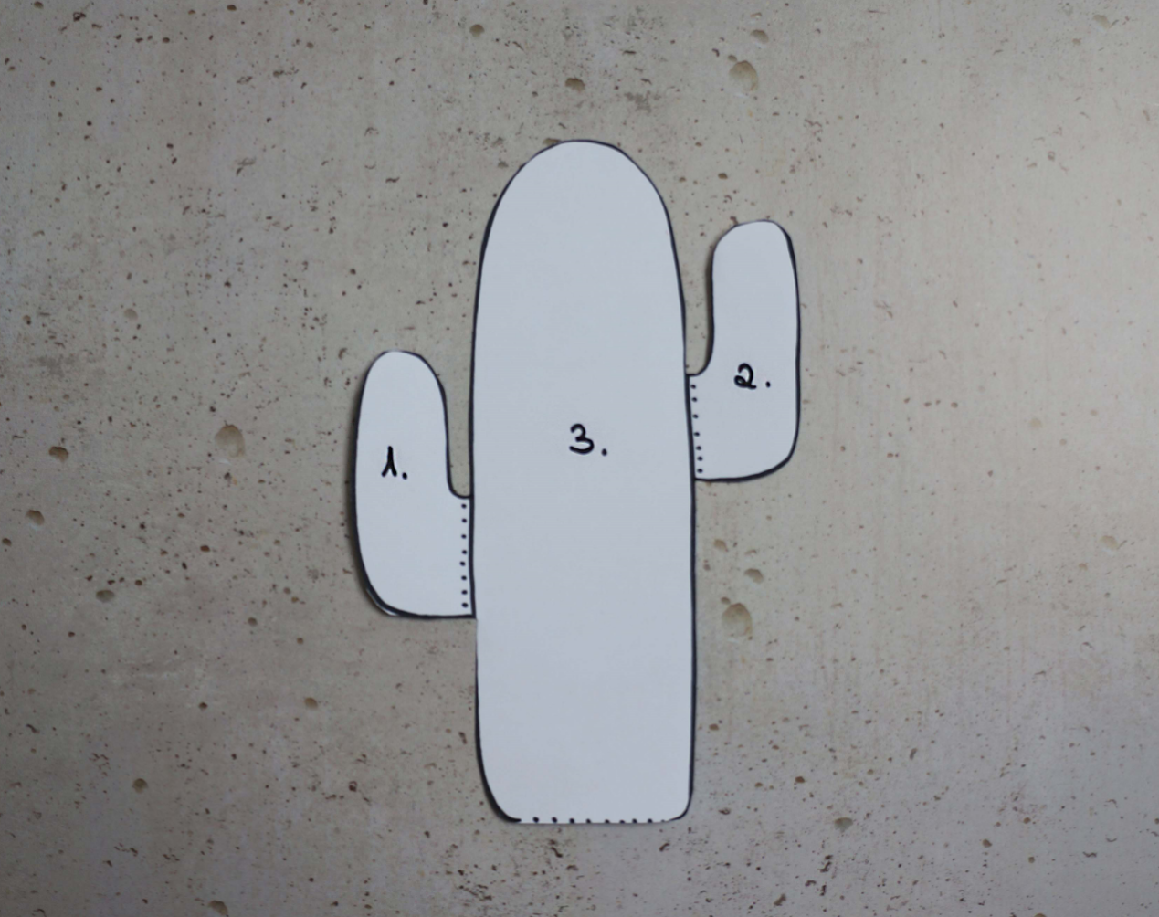Zu allererst zeichnet ihr euch auf einem Papier eine Schablone für euren Kaktus. Die Zeichnung besteht aus drei Teilen, dem Mittelteil des Kaktus und zwei Armen. Die genaue Größe und Form könnt ihr hierbei frei gestalten.