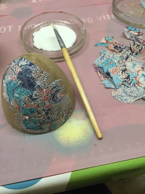 Weiter geht’s es mit dem Bekleben. Hierzu streicht ihr das Ei, an der Stelle, die ihr bekleben wollt großzügig mit dem Kleber ein. Dann klebt ihr immer wieder ein Stückchen von den zuvor zerrissenen Papier auf. Achtet hierbei besonders darauf, dass wirklich jedes Stück wieder mit Kleber bedeckt ist. Frei nach dem Motto, „viel hilft viel“ .Der viele Kleber ist nötig, da das  Papier keinen Kleber durch lässt und somit ohne nicht von allein hält. So würden später dann Unebenheiten entstehen. Benutzt Ihr aber genug Kleber und arbeitet sorgfältig, erzielt ihr ganz leicht ein tolles Ergebnis.