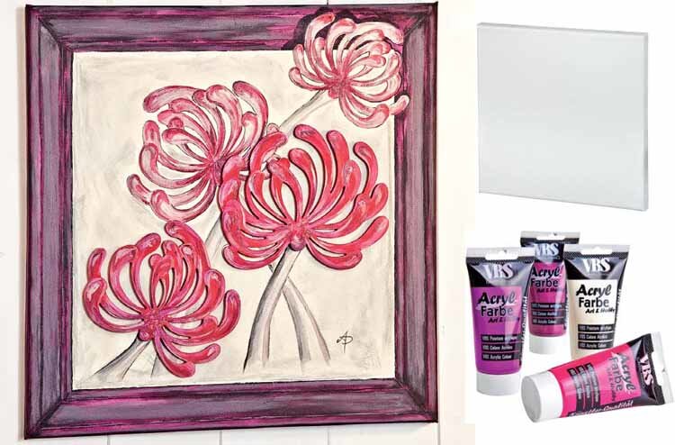 Ondersteund door de MDF-decorchrysanten heeft deze prachtig beschilderde chrysant ook een Schildersdoek 3D-effect. Met onze materiaallijst en de instructies voor het downloaden kunt u dit ook doen.