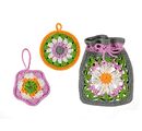 • Ondertitels: Anleitungsbuch, Anleitungskarten, Spannbrett, Maschenmarkierer, Scherenring, Häkelnadel, Baumwollgarn