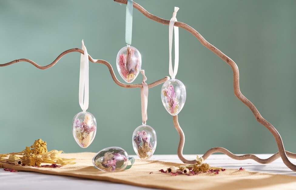 1. Pro Osterei je eine Eihälfte mit beliebigen Trockenblumen füllen.