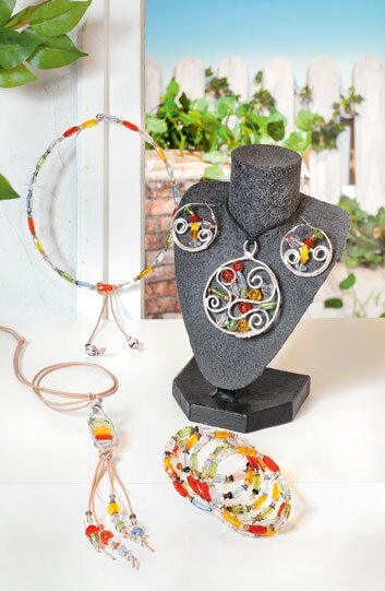 In mehreren Schritten Acryl-Perlen und Eyelets auffädeln und an den Spiralen befestigen.