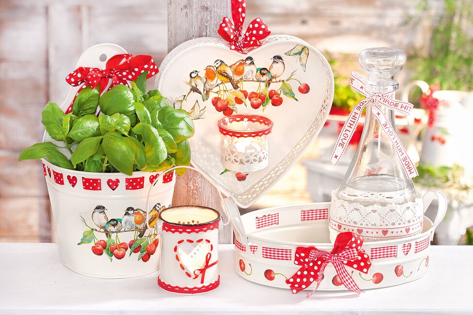 Einen Farbtrend mitmachen ist so eine Sache: sind es nicht gerade alltagstaugliche Farben, ist die Dekoration kein Evergreen. Doch mit Rot-Creme liegen Sie nie verkehrt. Hier zeigen wir Ihnen wie Sie einige Dekoartikel ganz einfach mit Serviettentechnik und ein paar Schleifen liebevoll und hübsch verzieren können.
