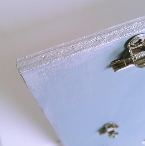Nun können die Briefklemmen mit Heißkleber angebracht werden. Ich habe einen dicken Klebepunkt zwischen Halter und Clip angesetzt und diesen auf die Spanplatte gedrückt. Vorher aber unbedingt die Abstände messen, damit die Briefklemmen ordentlich gesetzt sind und die Säcke genügend Platz zum Nachbarn haben. Bei meinem 60 cm breitem Brett habe ich jeweils einen Klebepunkt nach 7,5; 22,5; 37,5 und 52,5 cm gesetzt. Zur unteren Reihe habe ich ab dem Clip der Vorreihe gemessen und nach 18 cm wieder einen Klebepunkt gesetzt. 5.) Verzierungen mit VBS Art Metall