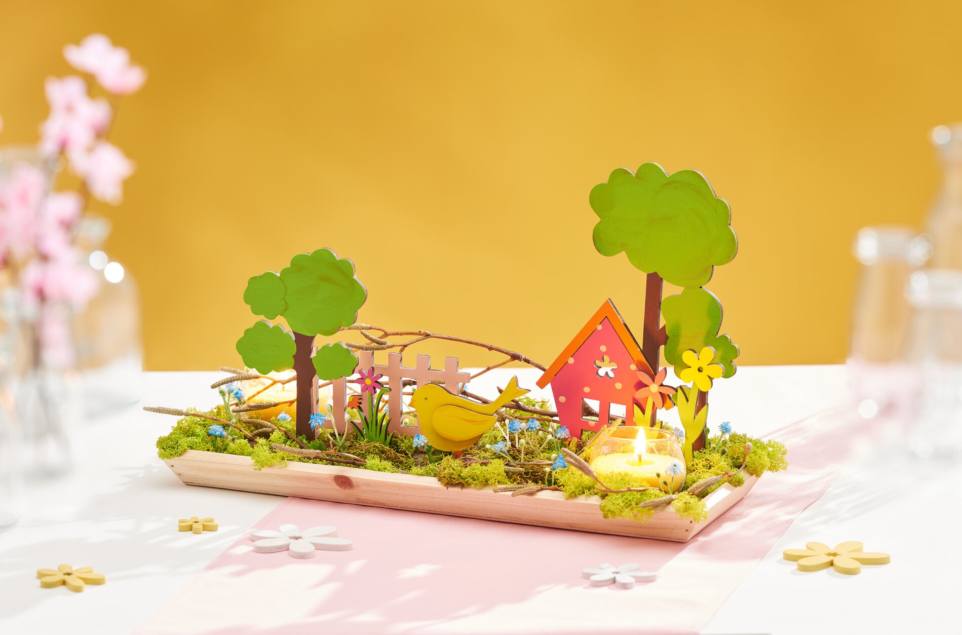 4. Dekorative Akzente setzen Jetzt bekommt dein Holzschalen-Tablett seinen natürlichen Charme. Verteile Islandmoos, Birkenzweige und getrocknete Blüten der Acker-Witwenblume zwischen den Steckmotiven. Die natürlichen Materialien verleihen dem Arrangement eine frische, organische Note und lassen die Farben besonders schön wirken.