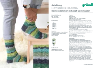 Gründl Hot Socks "Madena" wird als 100 g Knäuel mit einer Lauflänge von ca. 420 m geliefert. Zur Anfertigung eines Pullovers in Größe 38 wird ca. 500 g, für ein paar Socken bis Größe 46 ca. 100 g Hot Socks Madena Wolle benötigt. Es wird zum Stricken und Häkeln eine Nadel in der Stärke 2,5 – 3,0 mm empfohlen.