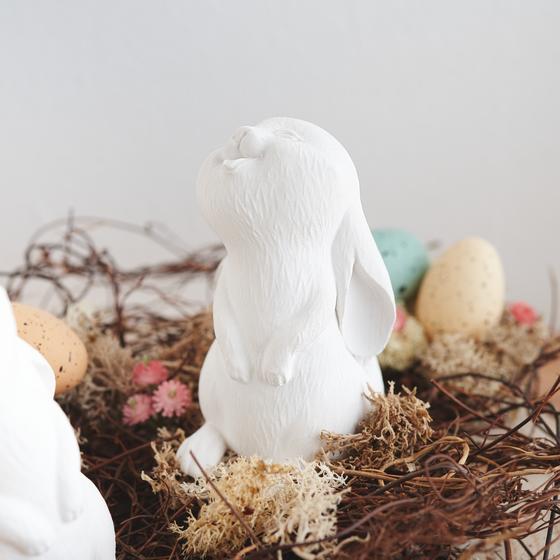 Lasse die Gießmasse etwa eine Stunde trocknen. In dieser Zeit beginnt die Masse auszuhärten und nimmt die Form des Hasen an. Geduld ist hier gefragt, da ein zu frühes Entfernen zu Brüchen führen könnte.
