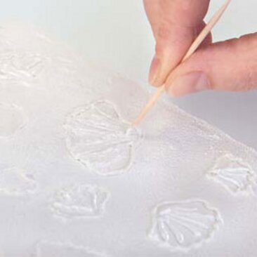 Streichen Sie Strukturpaste auf acht der Keilrahmen auf. Nach dem Trocknen übertragen Sie die Motive vom Vorlagebogen und ziehen die Konturen mit Strukturpaste nach (siehe rechts). Lassen Sie die Konturen gut durchtrocknen um anschließend die Details auszuarbeiten. Die gelingen Ihnen am besten, wenn Sie wenig Strukturpaste in die Zwischenräume geben und mit einem Schaschlikspieß feine Rillen einarbeiten.