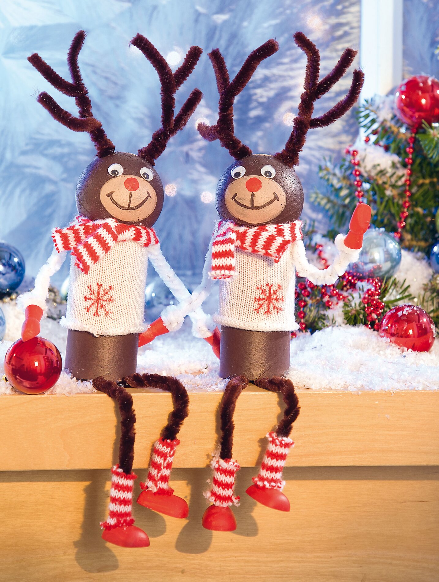 Jetzt nur noch mit einem ganz feinen Pinsel oder einem roten Filzstift eine Schneeflocke auf den Pullover malen und ein Stück Strickschlauch als Schal um den Hals binden – fertig ist ein lustiges Rentier.