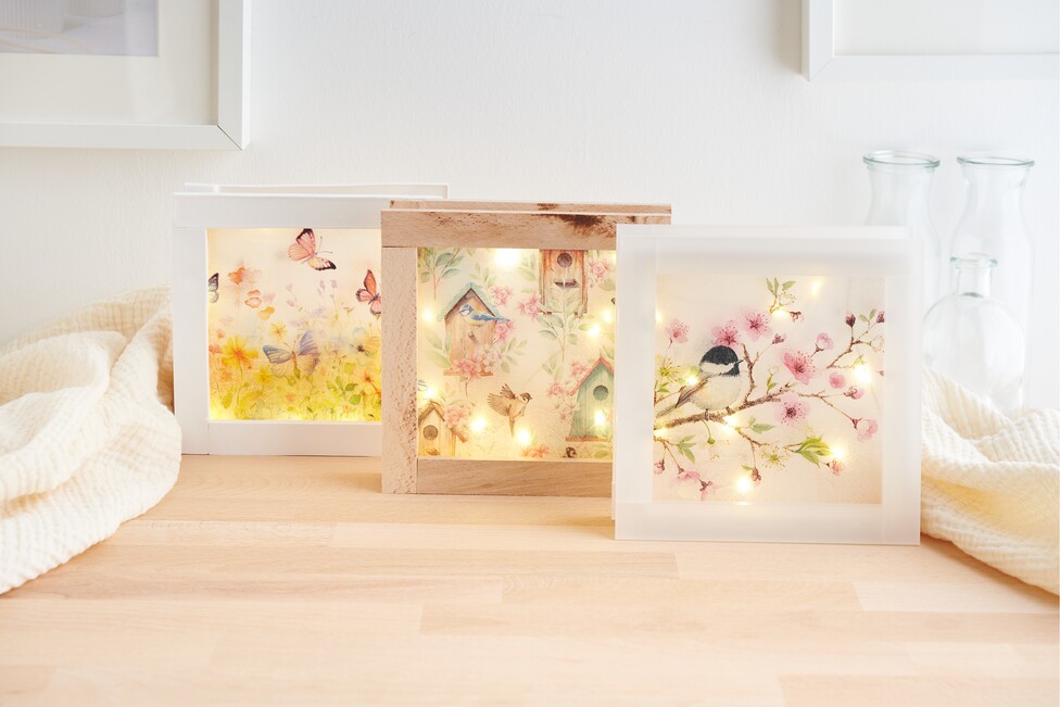 Nachdem die dekorative Folie vollständig getrocknet ist, klebst du sie in die Rahmen. Dann bringst du die zwei Rahmen sorgfältig am Korpus an, um deinen Lichtrahmen zu vollenden.
