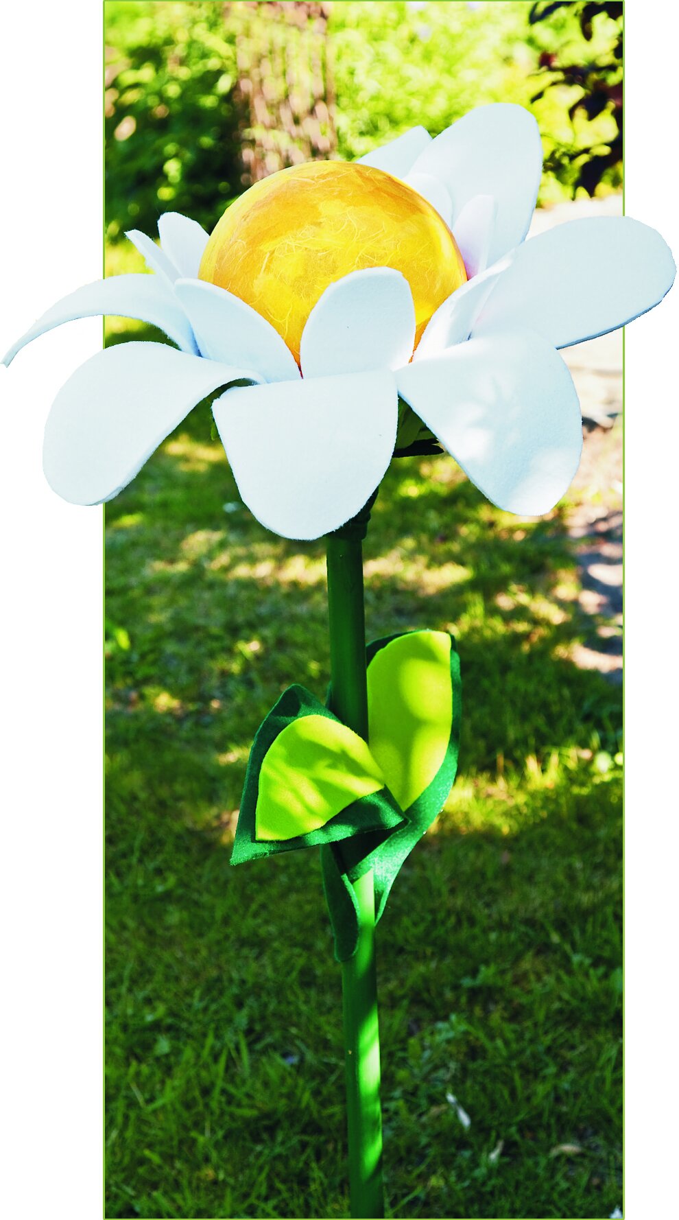 Grundiere den Rundstab mit grüner Farbe, lasse diese trocknen. Den Rundstab in die Acryl-Kugel stecken und mit Heißkleber fixieren. Die kleineren Blütenblätter bis zur Mitte mit Heißkleber an die Kugel kleben und mit den größeren Blütenblättern den äußeren Kranz gestalten.