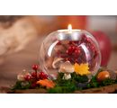 Teelichthalter "Glaskugel" mit einem Durchmesser von ca. 10 cm und einer Höhe von ca. 8 cm. Offene Glaskugel mit einer runden Standplatte aus Holz.