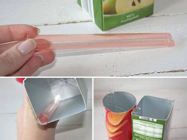 Bevor ihr den Beton anrührt solltet ihr als Erstes eure Formen vorbereiten. In meinem Beispiel habe ich mit verschiedenen Tetrapacks und einer leeren Chipsrolle gearbeitet. Der Vorteil dieser Gießformen ist, dass sie sich leicht zurechtschneiden lassen, wasserdicht sind und später einfach aufgeschnitten werden können.
