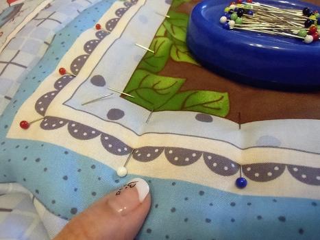 Zuerst müsst ihr alles mit Stecknadeln feststecken und mit der Nähmaschine fußbreit absteppen. (Anfang und Ende der Naht immer verriegeln – nicht vergessen, sonst geht die Naht wieder auf!). Dabei eine ca. 20 cm breite Wendeöffnung an der Seite lassen. Damit man nicht voller Elan die ganze Decke rundherum absteppt und die Wendeöffnung vergisst, markiere ich mir diese Stelle immer mit 2 Stecknadeln, so weiß ich dann, dass ich an der Wendeöffnung angekommen bin.