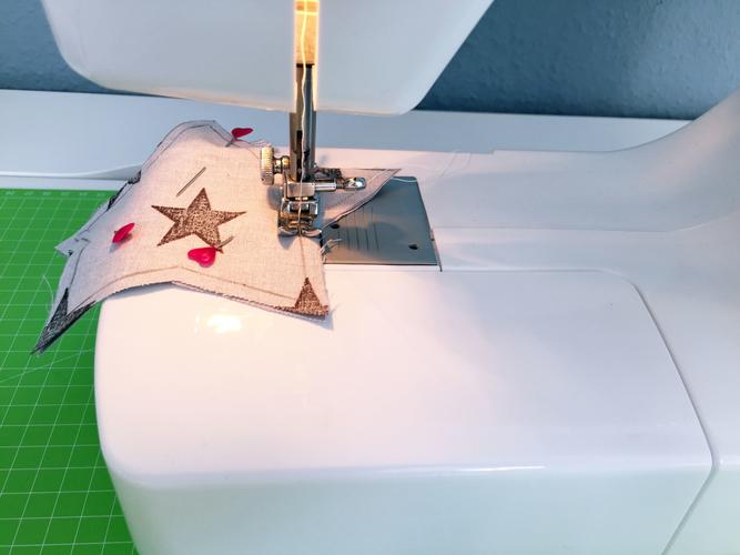 Im nächsten Schritt müsst ihr jede Menge Sterne mit eurer Vorlage auf eure Stoffe übertragen und anschließend ausschneiden. Zeichnet euch die Vorlage auf der linken Seite des Stoffes auf. Wer mag, kann sich auch die Saumlinie mit einzeichnen als Hilfe später beim Nähen. Denkt daran, dass ihr pro Stern zwei Stoffzuschnitte benötigt. Insgesamt müsst ihr am Ende also 48 Sterne aus Stoff ausgeschnitten haben.