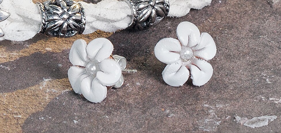 Put the Ear hole stud ready and give a little Jewellery glue on the Plugs. Glue the leather flower in the color of your choice on the Plugs. Afterwards only is still missing the wax pearl, which must be stuck on the flower. For this, grab the Pearl carefully with tweezers and fix it also with a little Jewellery glue on the flower. Then you should let everything dry well.