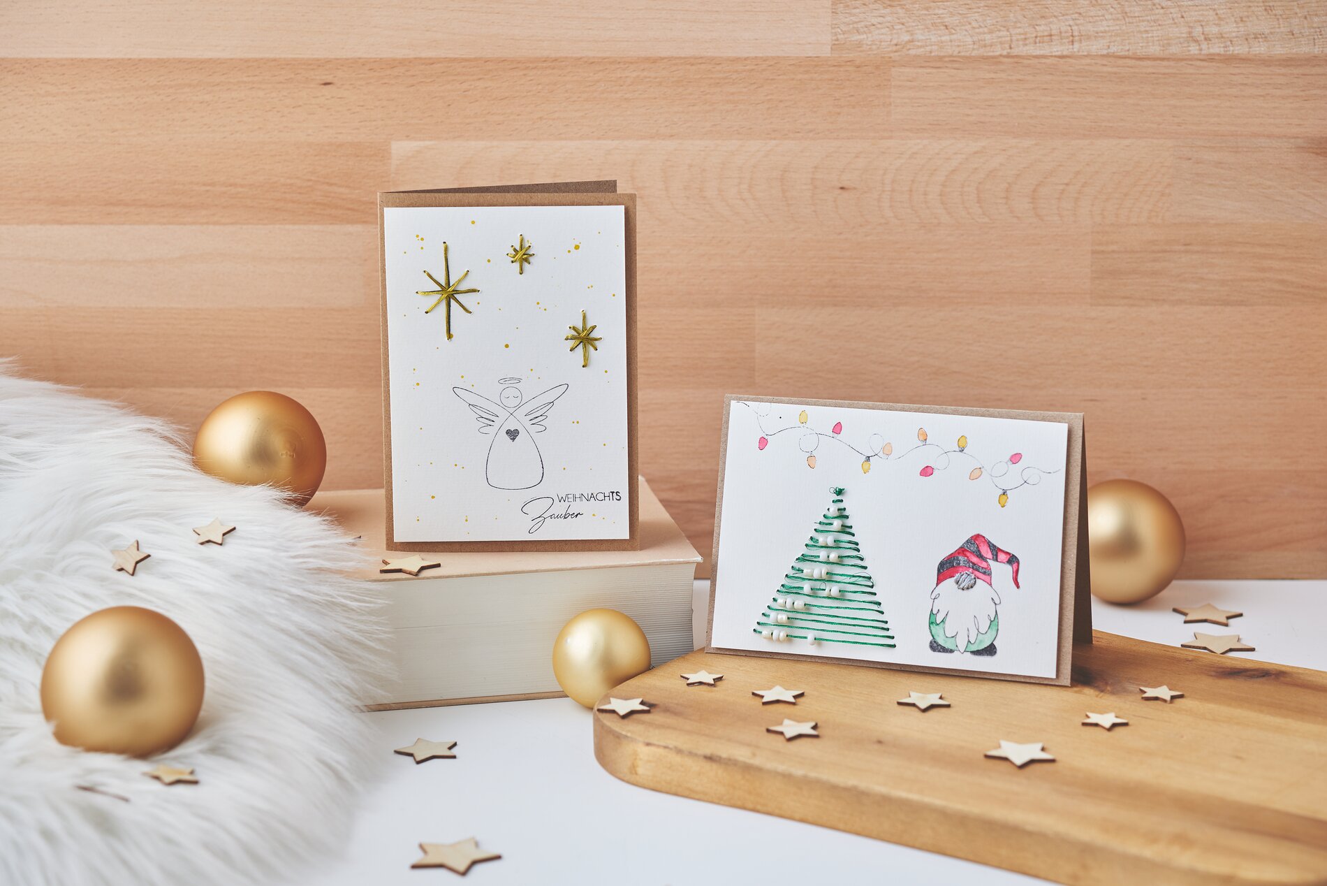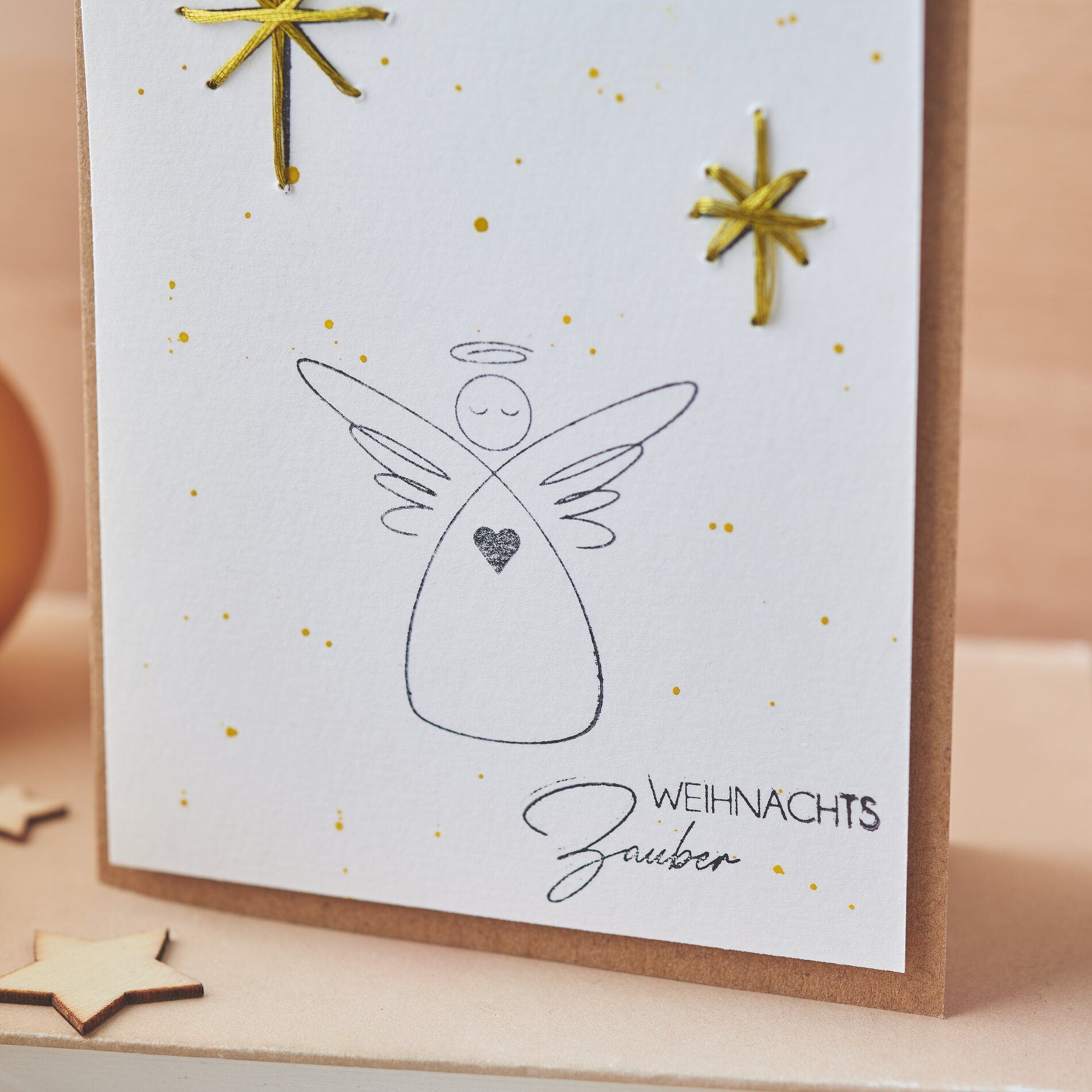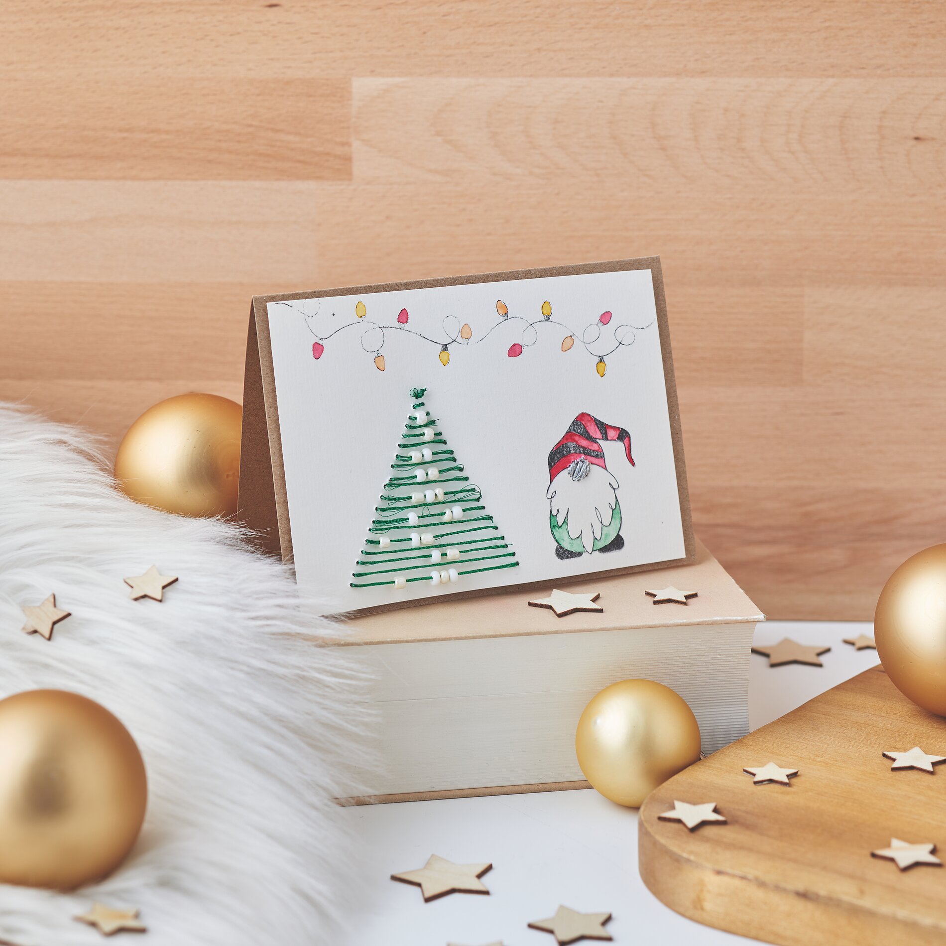 Now comes the centrepiece of your card - the embroidery! Take embroidery twist (also known as embroidery yarn) and a needle. Embroider the contours of the motifs. For additional accents, you can work with sparkling rocaille beads that you thread onto the yarn.
