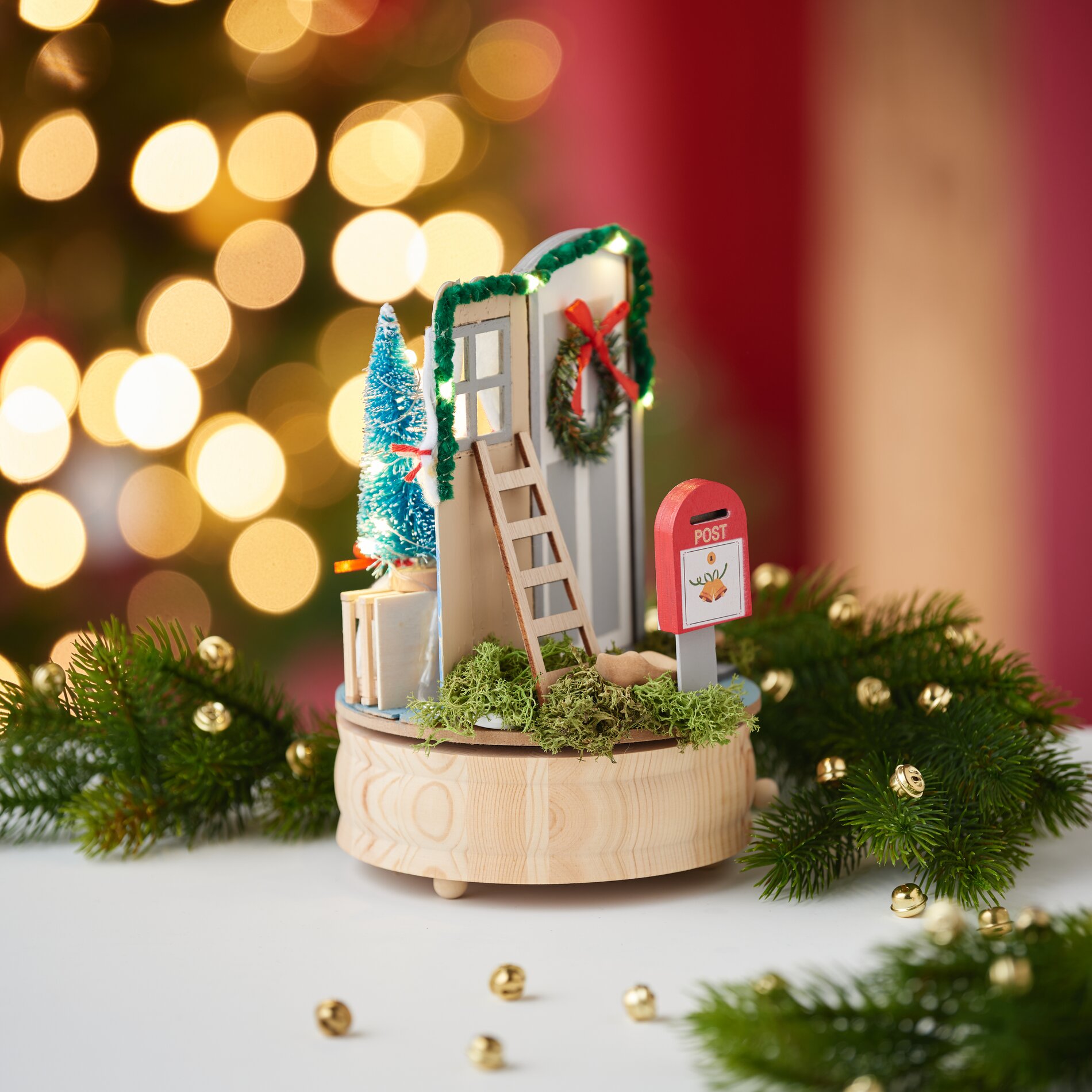 Glue the post box to a wooden stick and also glue this to the base plate. You can also fix the ladder, the tree and the wooden shoes to the music clock with a little hot glue.