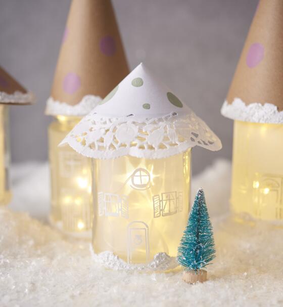 For two glasses, cut two rectangles measuring 19 x 7.5 cm out of star foil and stick them into the glasses. These glasses are dabbedFrost effect with paint. Painting sponges are ideally suited for this. After drying, paint with a Marker open the windows and doors. If necessary, please use our free motif template.