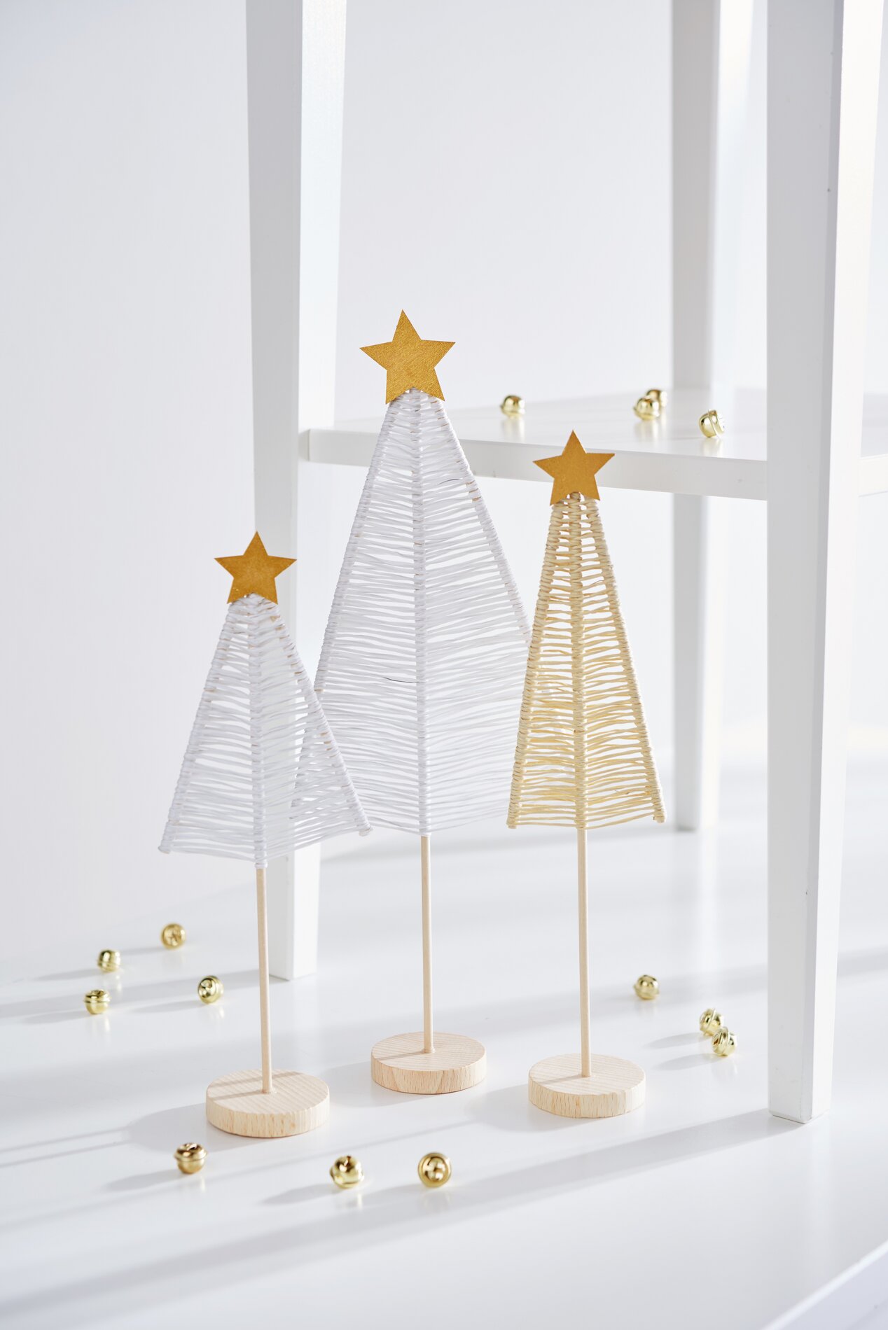 De volgende stap is het omwikkelen van het frame met de gewenste papierdraad. Begin in het midden met de volgende volgorde: wikkel één keer, wikkel één keer rechts, wikkel één keer in het midden, wikkel één keer links, wikkel één keer in het midden, wikkel één keer rechts, wikkel één keer in het midden, wikkel één keer links.... Herhaal dit proces voor alle sparren. Lijm de uiteinden van de ronde stokjes vast met hobbylijm, zodat de draad niet loslaat.