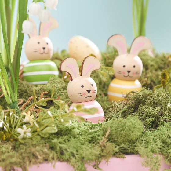 Placez des petits œufs de Pâques et des lapins dans l'arrangement. Pour que tout tienne bien, fixez-les ainsi que les petites fleurs individuelles avec un peu de colle chaude.