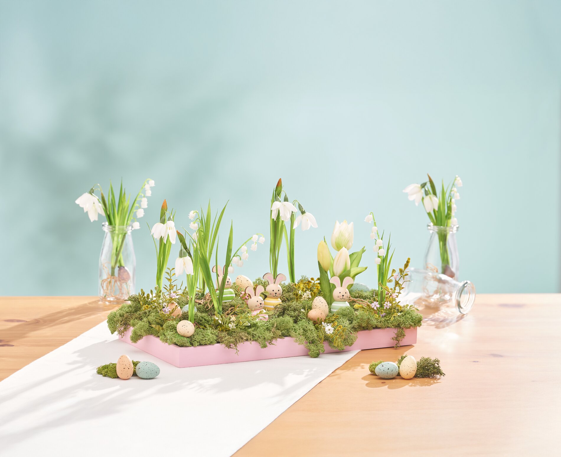 Une fois la peinture sèche, recouvrez l'intérieur du plateau avec mousse florale:. Fixez-le avec un peu de colle chaude et appuyez fermement sur la surface. Recouvrez le mousse florale de Mousse, de manière à ce qu'il soit entièrement recouvert. Disposez maintenant le muguet, le pic à fleurs, les tulipes et les perce-neige dans votre composition : placez simplement les fleurs artificielles à l'endroit souhaité Position dans mousse florale , éventuellement en les coupant au préalable à la longueur parfaite. Vous obtiendrez une composition vivante et dynamique si vous variez les hauteurs et les couleurs des fleurs.