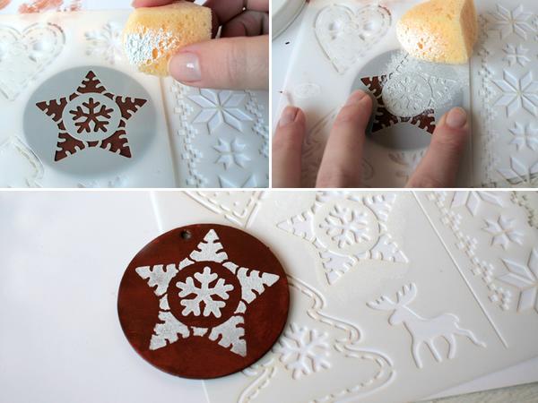 Auch die Metallicfarbe gut durchtrocknen lassen – durch die Farbschicht darunter braucht sie etwas länger. Danach nehmen wir uns die weiße Farbe und die Schablone zur Hand. Nun können je nach Geschmack und Ideen die einzelnen Anhänger verziert werden. Dazu das gewünschte Motiv auf den jeweiligen Anhänger legen, etwas weiße Farbe auf den Schwamm geben und die Farbe tupfend innerhalb der Schablone verteilen.