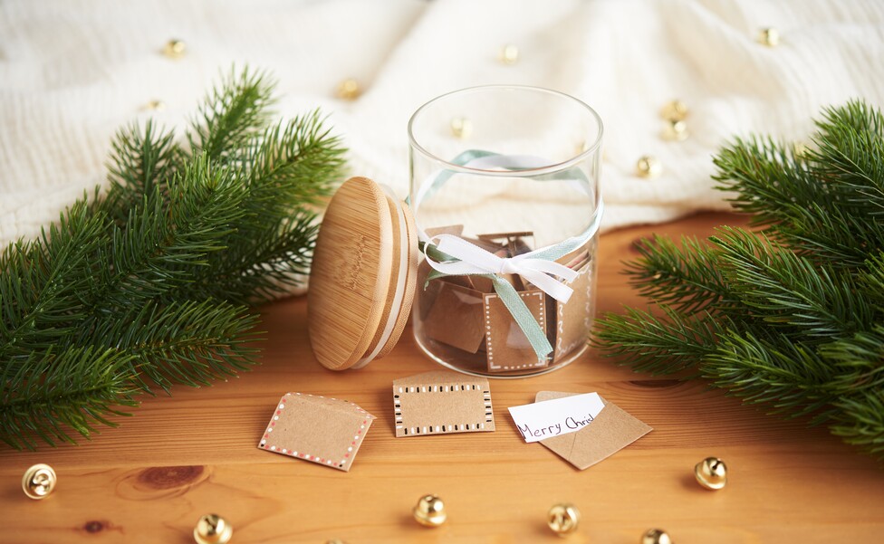 Place les enveloppes remplies dans un bocal. Tu peux décorer le bocal à ta guise ou le laisser simple - comme tu le souhaites. Le verre transparent laisse déjà transparaître quelques-unes des enveloppes colorées et éveille la curiosité du destinataire.