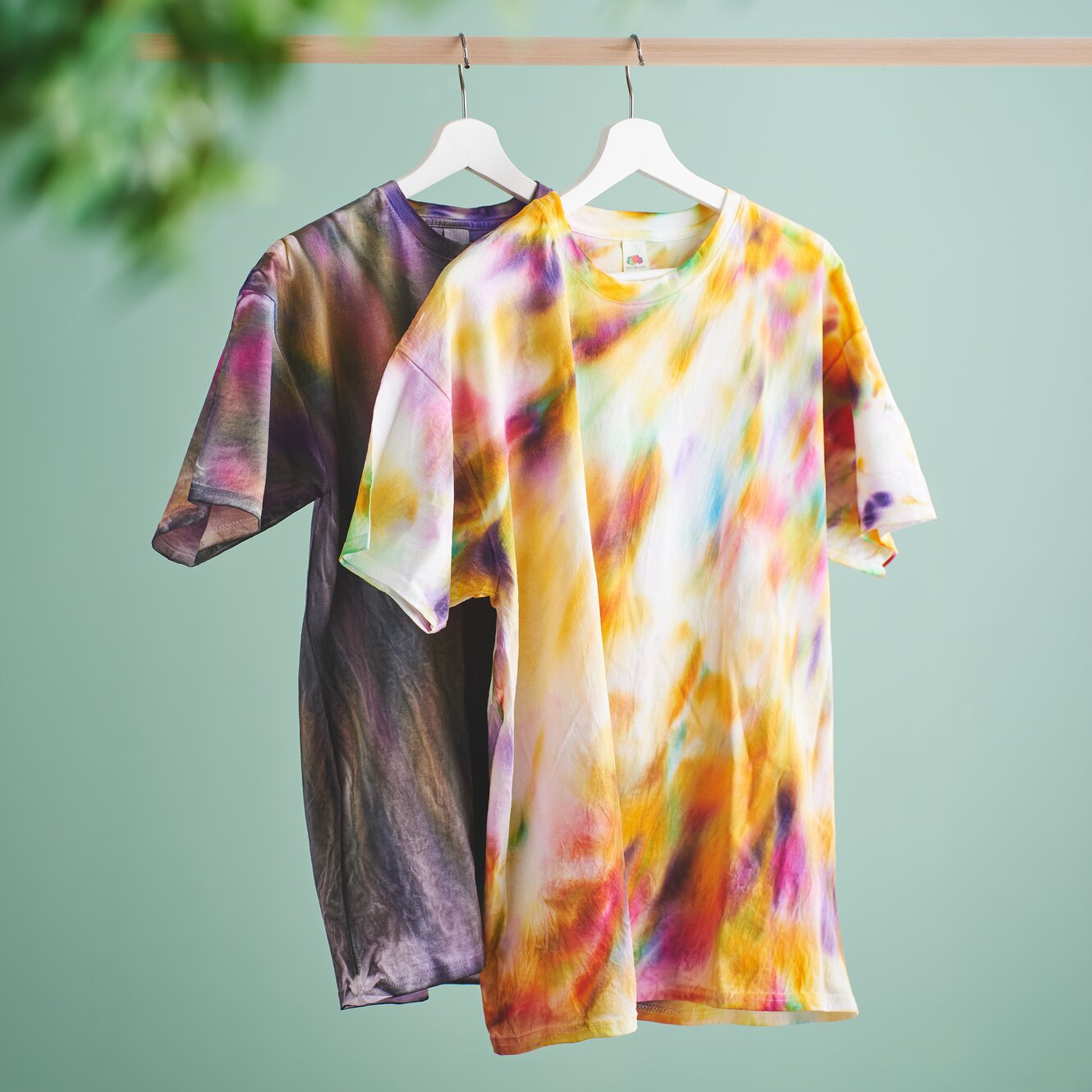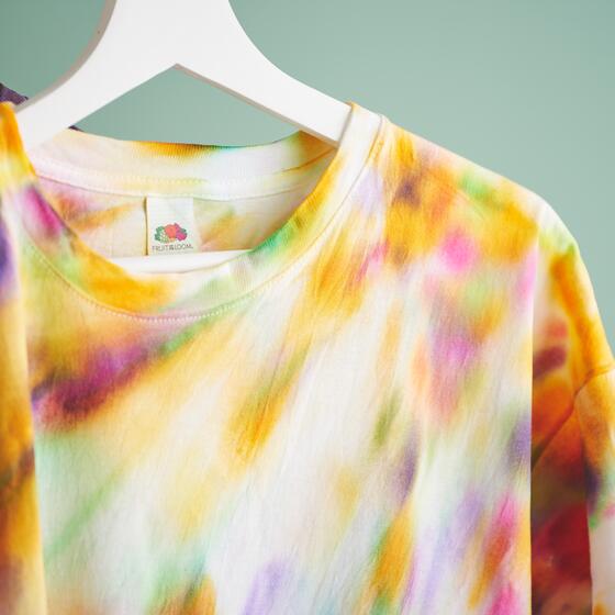 Une fois la teinture terminée, dépliez délicatement le t-shirt. Ne tirez pas trop sur le tissu afin de préserver les dégradés de couleur. Suspendez ensuite le t-shirt et laissez-le sécher complètement. Ce n'est que lorsque le tissu est complètement sec que vous pouvez fixer la couleur.