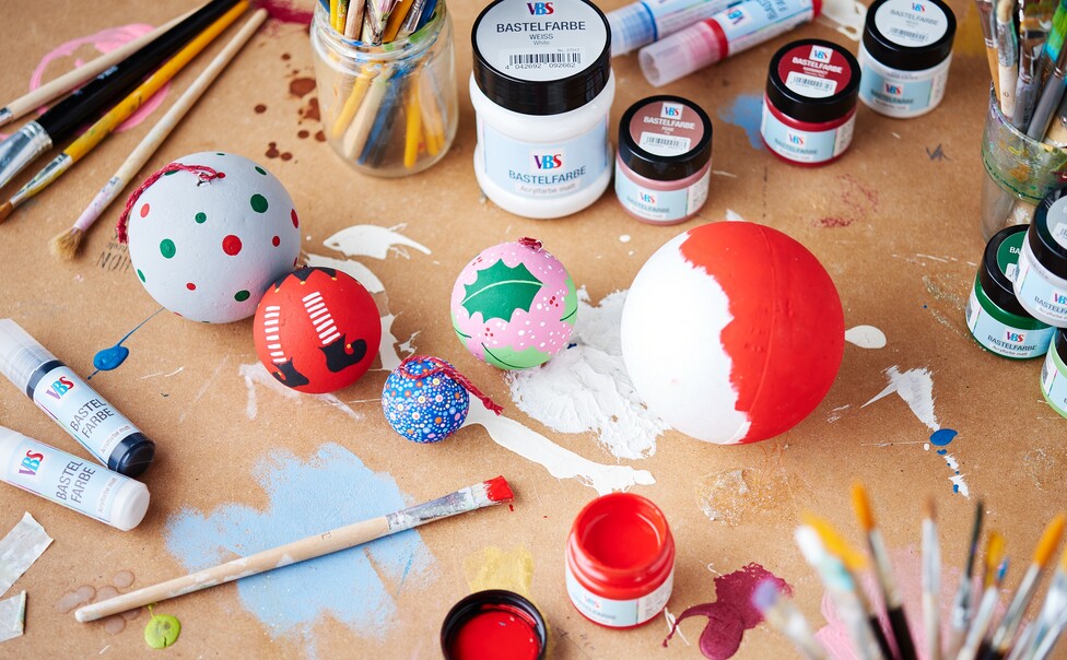 Créer une boule avec des feuilles de houxCommence par peindre entièrement la boule dans la couleur de ton choix avec de la peinture pour bricolage. Laisse la peinture sécher complètement avant de continuer. Place ensuite une feuille de papier graphite sur la boule et place dessus le modèle imprimé de la feuille de houx. Trace les lignes avec un stylo à bille pour que le motif se dessine sur la boule. Répétez cette opération jusqu'à ce que la boule soit entièrement recouverte de feuilles de houx. Colorie ensuite soigneusement les feuilles avec de la peinture pour bricolage et laisse bien sécher cette couche. Avec un pinceau fin et une autre couleur, ajoute les nervures au milieu des feuilles. Pour la touche finale, trempe un bâtonnet en bois Dot-Painting ou une brochette en bambou dans peinture acrylique multisupports et place de petits points colorés autour des feuilles.