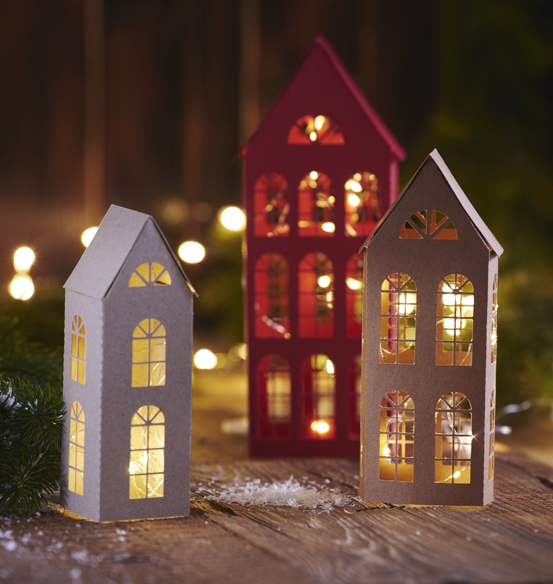 Vouw na het snijden het huisje op de plaatsen die met de stippellijnen op de sjablonen zijn aangegeven en lijm ze aan elkaar. Tot slot, lijm je gewoon het dak van het huis.
