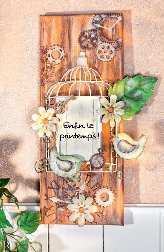 A présent, donnez un peu de couleur aux différents décors en métal : utilisez de la peinture Bouton d'or pour le pistil des fleurs et du Vert permanent pour les feuilles. Découpez quelques morceaux de fil d'aluminium. Tordez-en deux d'entre eux pour en faire des vrilles et attachez-les aux barreaux de la cage à oiseau. Collez les autres aux décors en métal. Fixez ensuite la cage au milieu du châssis entoilé et laissez sécher toute une nuit.