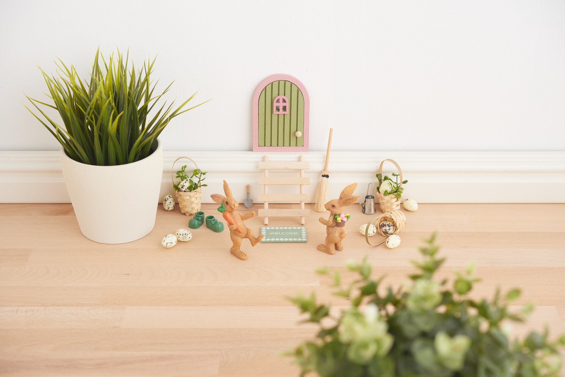 Placez la porte d'entrée soigneusement fabriquée avec son échelle sur une plinthe solide. Disposez la corbeille miniature et les autres éléments décoratifs de manière à créer une scène accueillante et cohérente.
