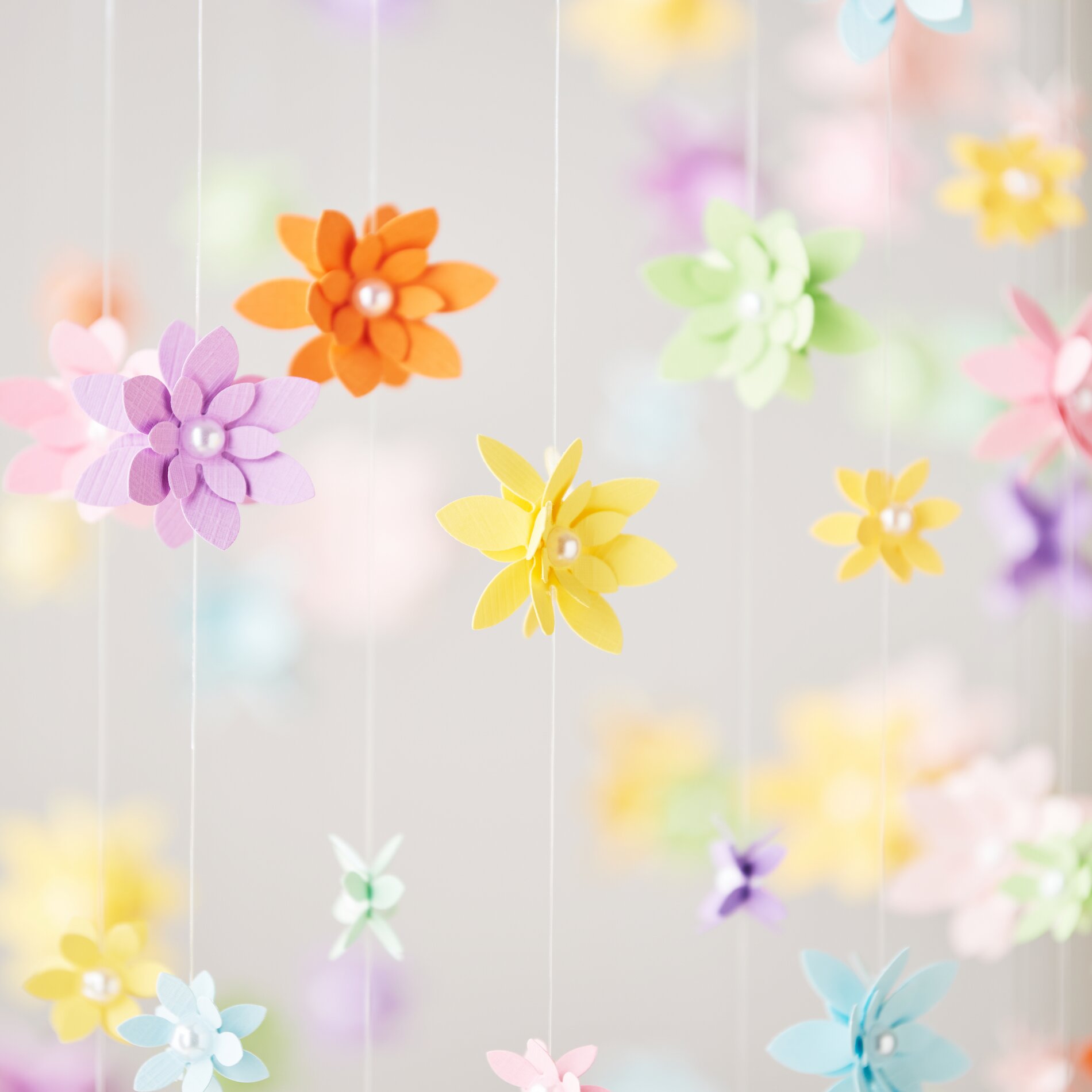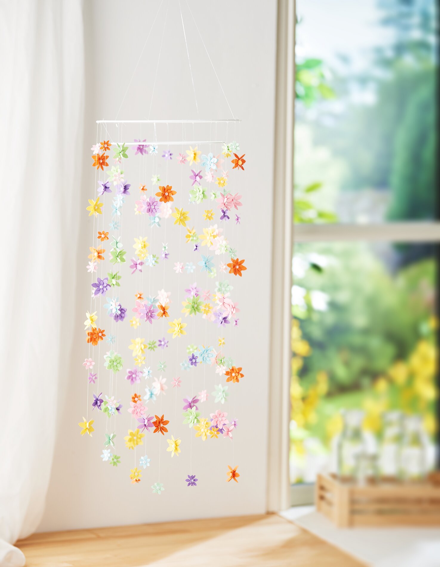 Ce mobile avec ses fleurs en papier aux couleurs vives est parfait comme décoration murale ou sur le site décoration de fenêtre . Il peut également être offert en cadeau. Et le meilleur dans tout ça, c'est que les fleurs sont très faciles à réaliser ! La combinaison de fleurs filigranes, de fils de perlon flottants et de deux anneaux donne une impression de légèreté et de modernité, et vous pouvez adapter la conception à votre goût personnel en variant le nombre de fleurs, le nombre et la taille des anneaux
