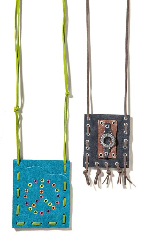 De part et d’autre du sac, enfilez un lacet de cuir marron d’env. 40 cm dans les perforations et faites un nœud au bout de chaque lacet.