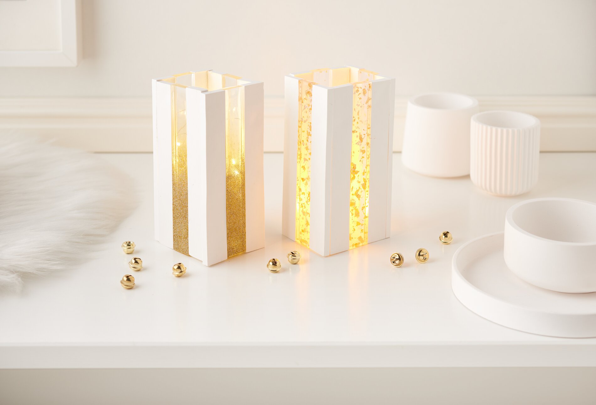 Placez la source de lumière : Placez une bougie chauffe-plat ou une petite guirlande lumineuse dans votre photophore fait maison. La lumière brille à travers les parties en résine transparente et est doucement diffusée par la raysine, ce qui crée une atmosphère particulièrement accueillante.