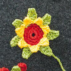 Avec une troisième couleur de laine, réalisez au tr suivant 7 petits pétales en quinconce (4 ml, revenez sur les mailles et faites 1 ms dans l’avant-dernière ml, 1 demi-br. et 1 br.). Pour vous faciliter l’ouvrage, rabattez les pétales du tr précédent vers l’intérieur et attachez chacun des petits pétales dans la troisième m grâce à 1 mc.