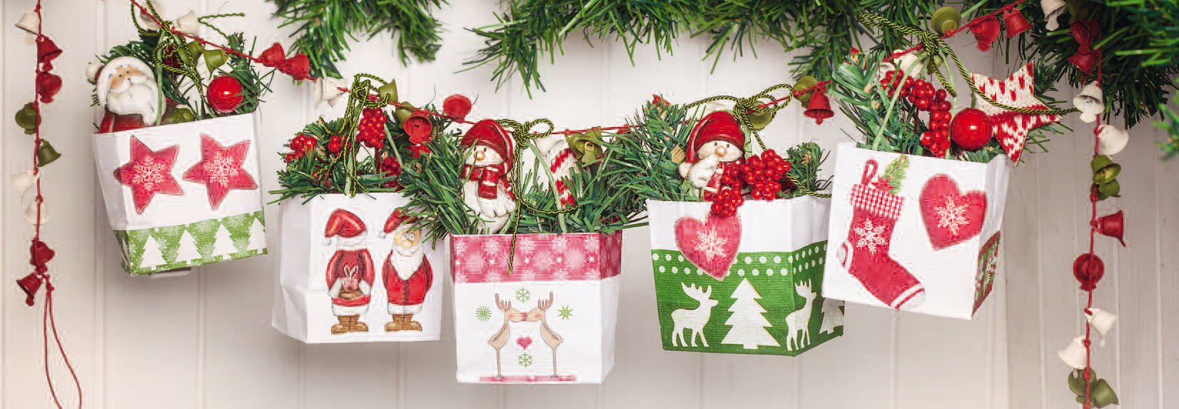 Au fur et à mesure que les sacs sèchent, coupez les branches de sapin en forme, disposez les pommes de Noël et les oiseaux décoratifs et coupez 24 morceaux de corde pour attacher les sacs au ruban de la cloche. Quand les sacs sont secs, vous pouvez commencer..