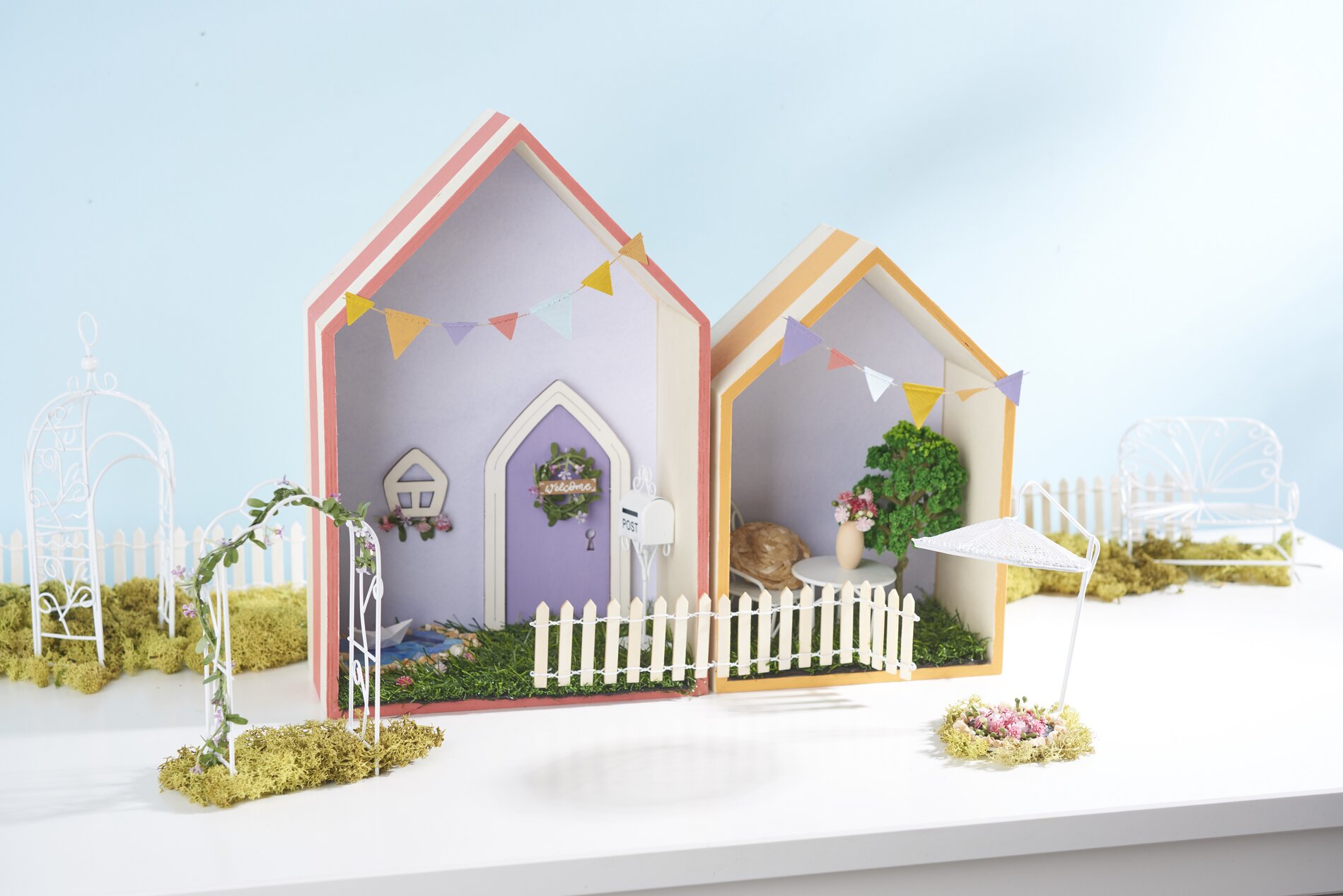 Verf de wimpelketting kleurig en bevestig hem aan de huizen.