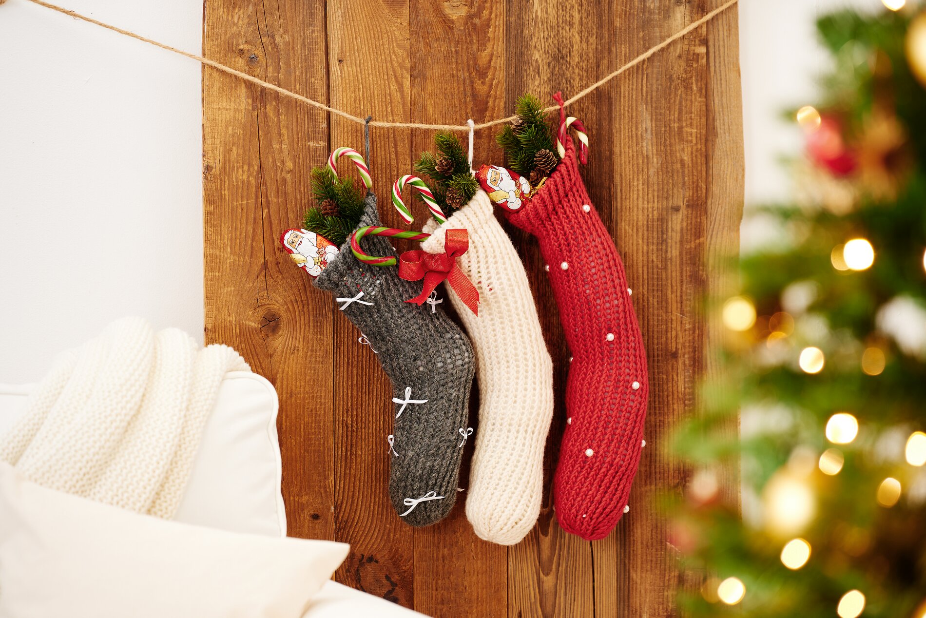 Tot slot kun je een draad aan de bovenkant van de sok bevestigen zodat je de nieuwe kerstsok later kunt ophangen. Versier hem verder naar je eigen smaak met strikjes en kleine opgenaaide kraaltjes.