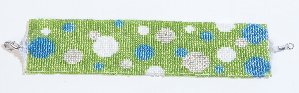 Meet vervolgens de omtrek van de pols met een meetlint en maak een overeenkomstige markering op de kettingdraden. Rijg nu voor elke rij 29 rocailles in volgens het patroon en druk ze met de wijsvinger van de linkerhand onder de kettingdraden omhoog, zodat de rocailles tussen de kettingdraden zitten