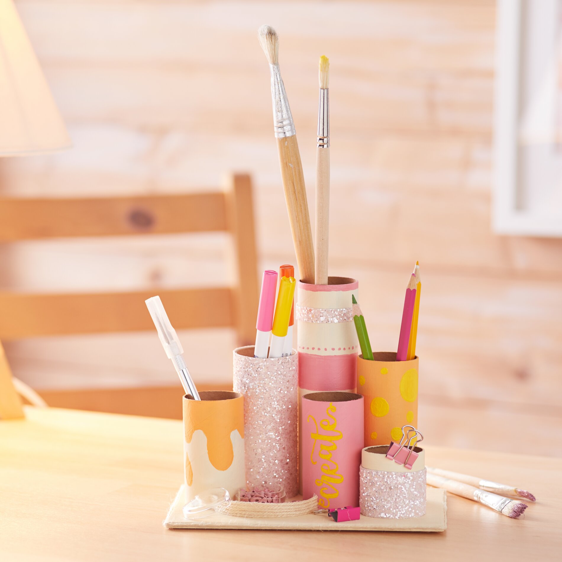 De pennendoos laat zien hoe praktisch en decoratief ambachtelijke projecten kunnen zijn. De zonnige glitterlook brengt een goed humeur op het bureau.