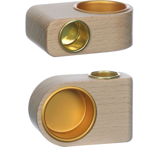 Ontdek de veelzijdigheid van onze elegante kandelaar van ruw hout met gouden tuitjes! Deze stijlvolle kaarsenhouder biedt je de mogelijkheid om zowel een staafkaars als een waxinelichtje te gebruiken. Met een binnendiameter van 2,2 cm voor staafkaarsen en 4 cm voor waxinelichtjes kan hij flexibel worden aangepast aan je decoratiewensen.