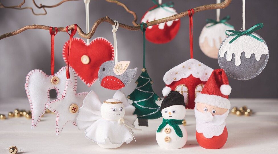 Knip de baard, sjaal of jurk (cirkelvormig) uit op Vilt . Lijm dan hoofd en lichaam samen. Lijm nu de sneeuwpop en de kerstman met knopen, baard, sjaal en muts naar wens. In het geval van de engel, plaats de jurk vorm tussen het hoofd en het lichaam en pas dan lijm je alles aan elkaar: Voor de jurk en de vleugels van de engel, knip een rechthoek uit Vilt , druk in het midden op elkaar om een bijeenkomst te creëren. Zo verzamelde je de Vilt eerst aan de jurk en daarna als vleugels.