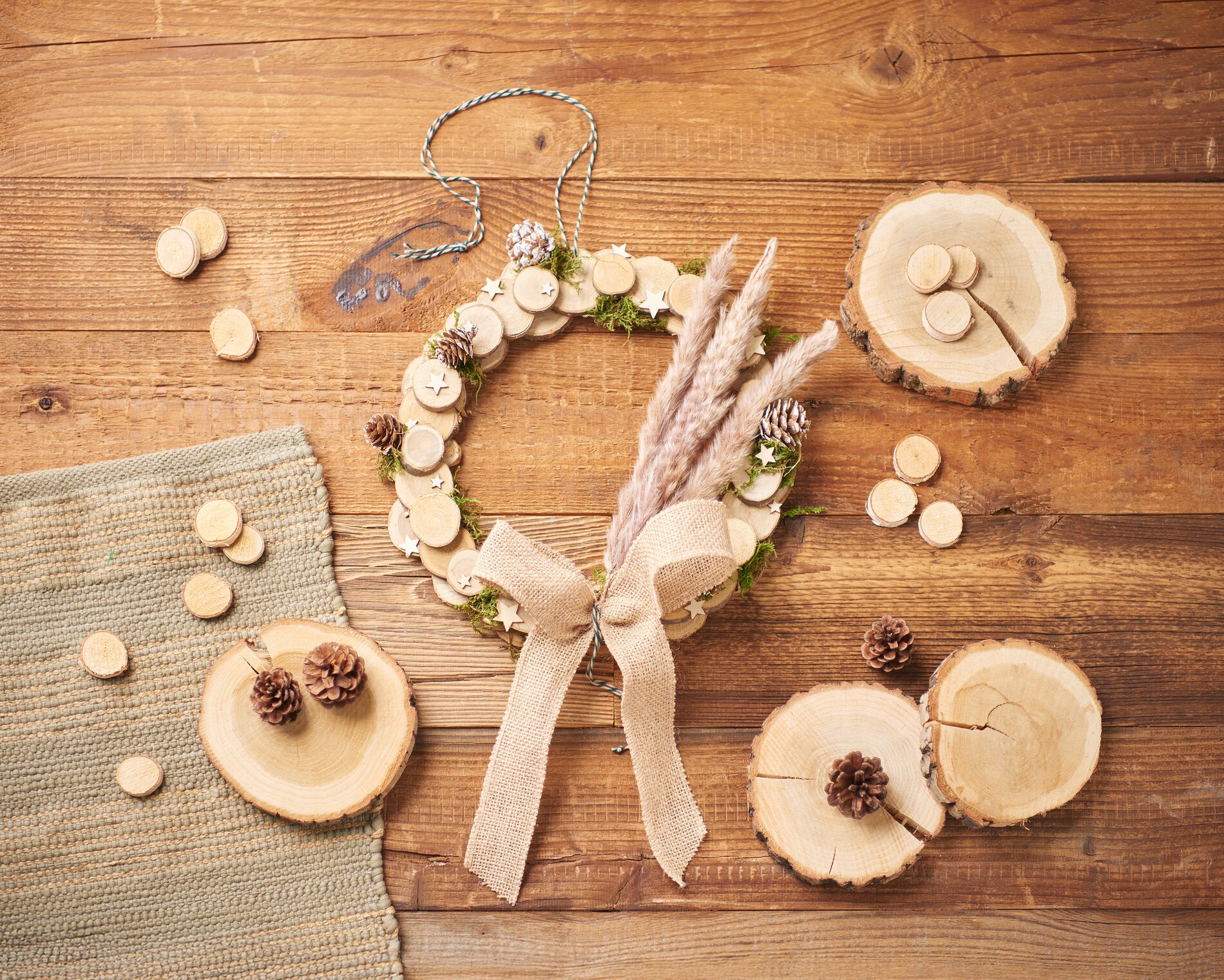 Knip tot slot een stuk van de katoenen koord en haal het door het geboorde gat. Knoop de uiteinden goed vast zodat je krans stevig hangt. Nu ben je klaar om je rustieke krans uit te stallen op je favoriete plek!