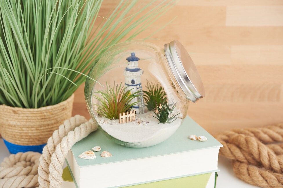 De pot met schroefdop met het maritieme vuurtorenlandschap is een echte blikvanger als hij helemaal is ingericht en zal een gevoel van strand en zee overbrengen.